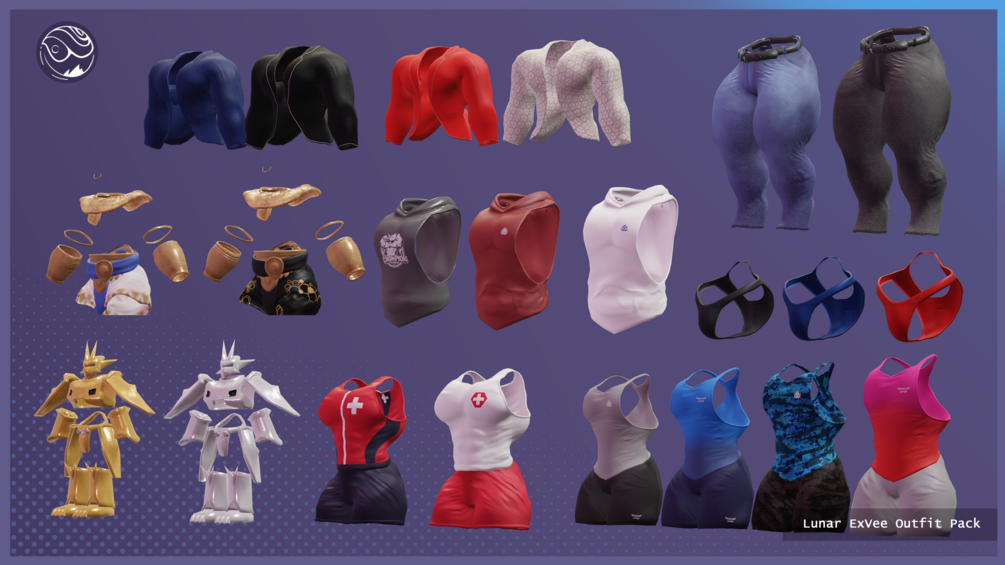 Lunar ExVee Unity Package alongside Substance Painter Files, Blend files and Textures, Lunar ExVee Outfit Pack Unity Package, Outfit Substance Painter Files, Outfit Blend files and Outfit Textures