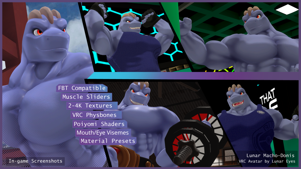 Presenting the Macho-Donis! A stout, well-driven trainee with a heart of gold and a body of iron! You can embody this fellow and show off some serious prowess in any VRChat gym world, or make your own with the props included, such as a set of Dumbbells and many more fun actions and toggles to mess around with.